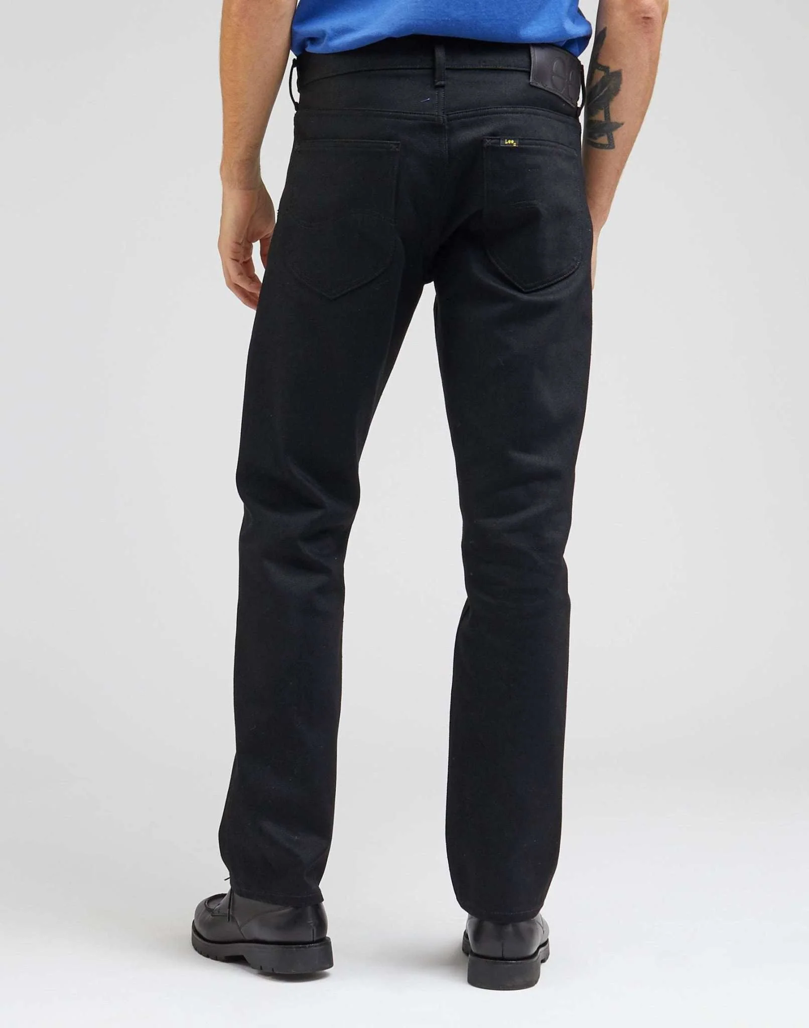 Le jean n’est pas délavé et a été fabriqué en denim noir pur teint en fil avec une bordure tissée bleue sur le revers.