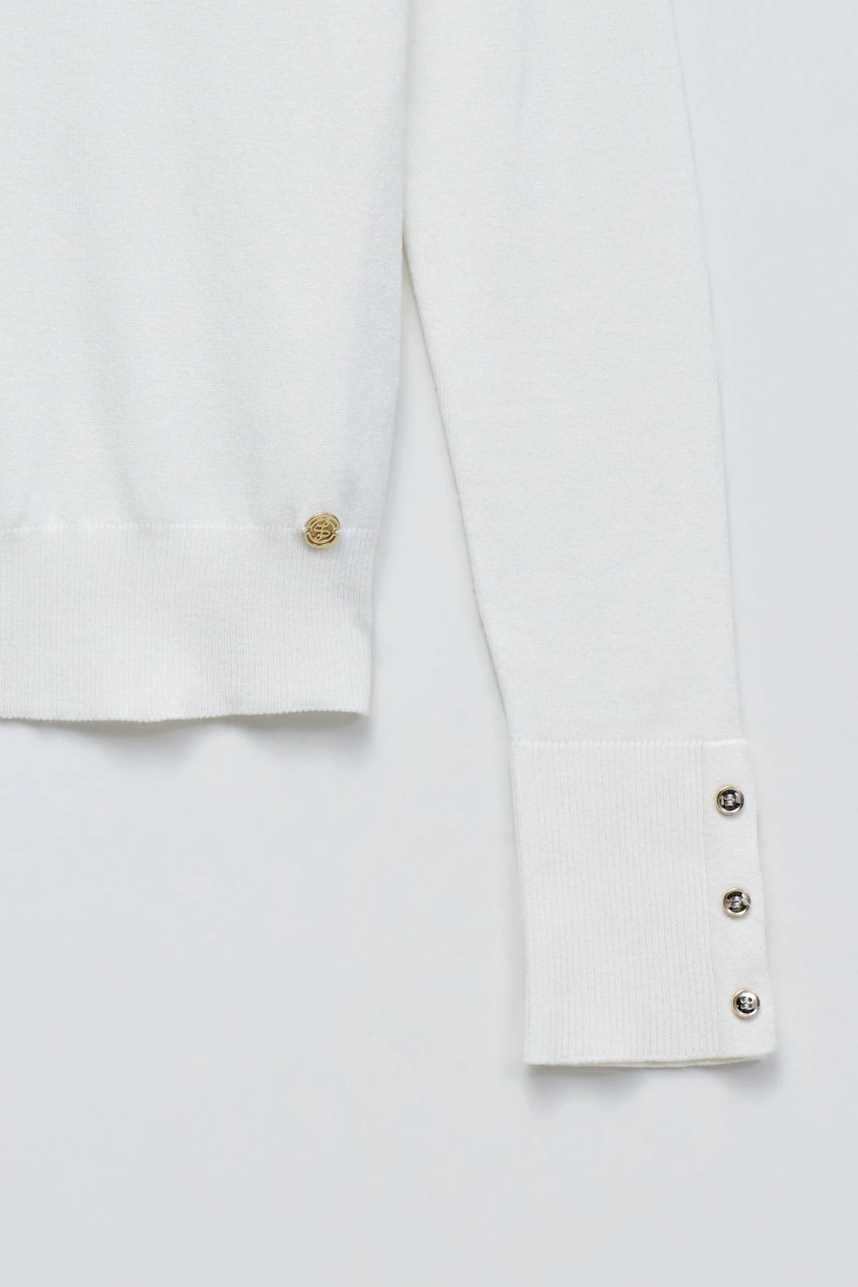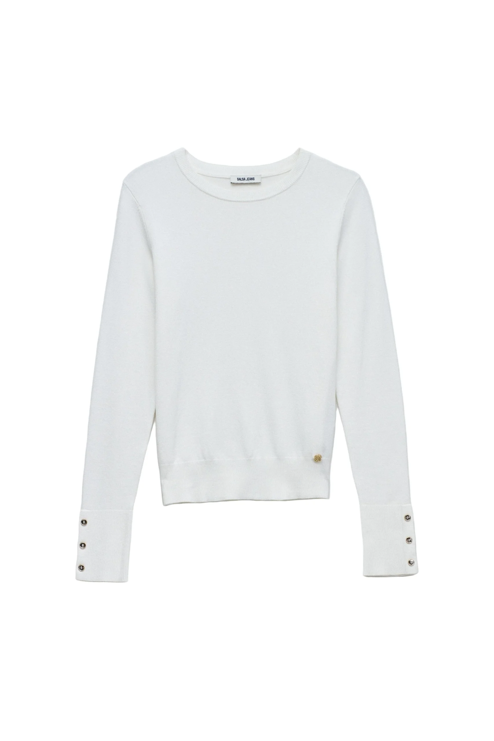 L’encolure arrondie et les détails en maille finement côtelée à l’ourlet et aux manches avec des accents de boutons confèrent une touche de style à ce design simple – idéal pour des combinaisons variées.