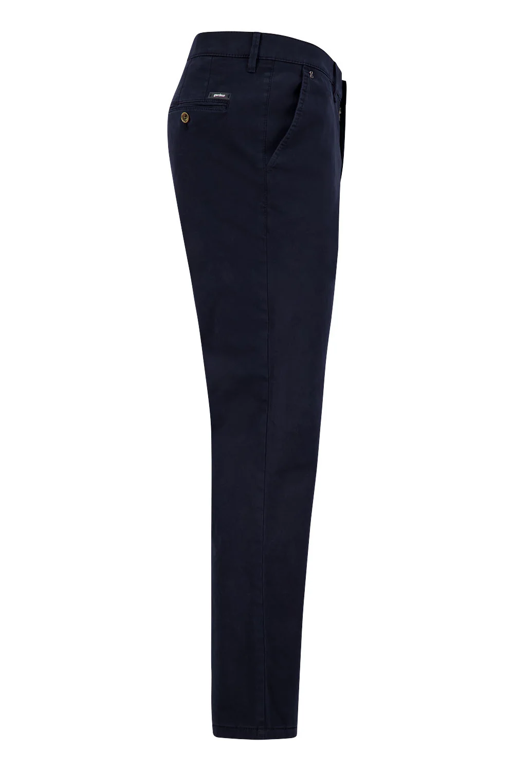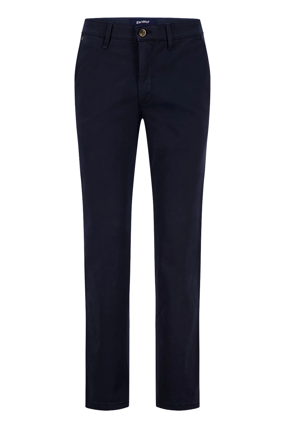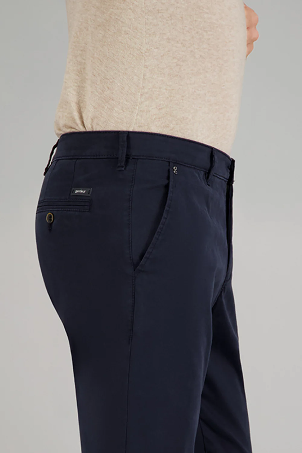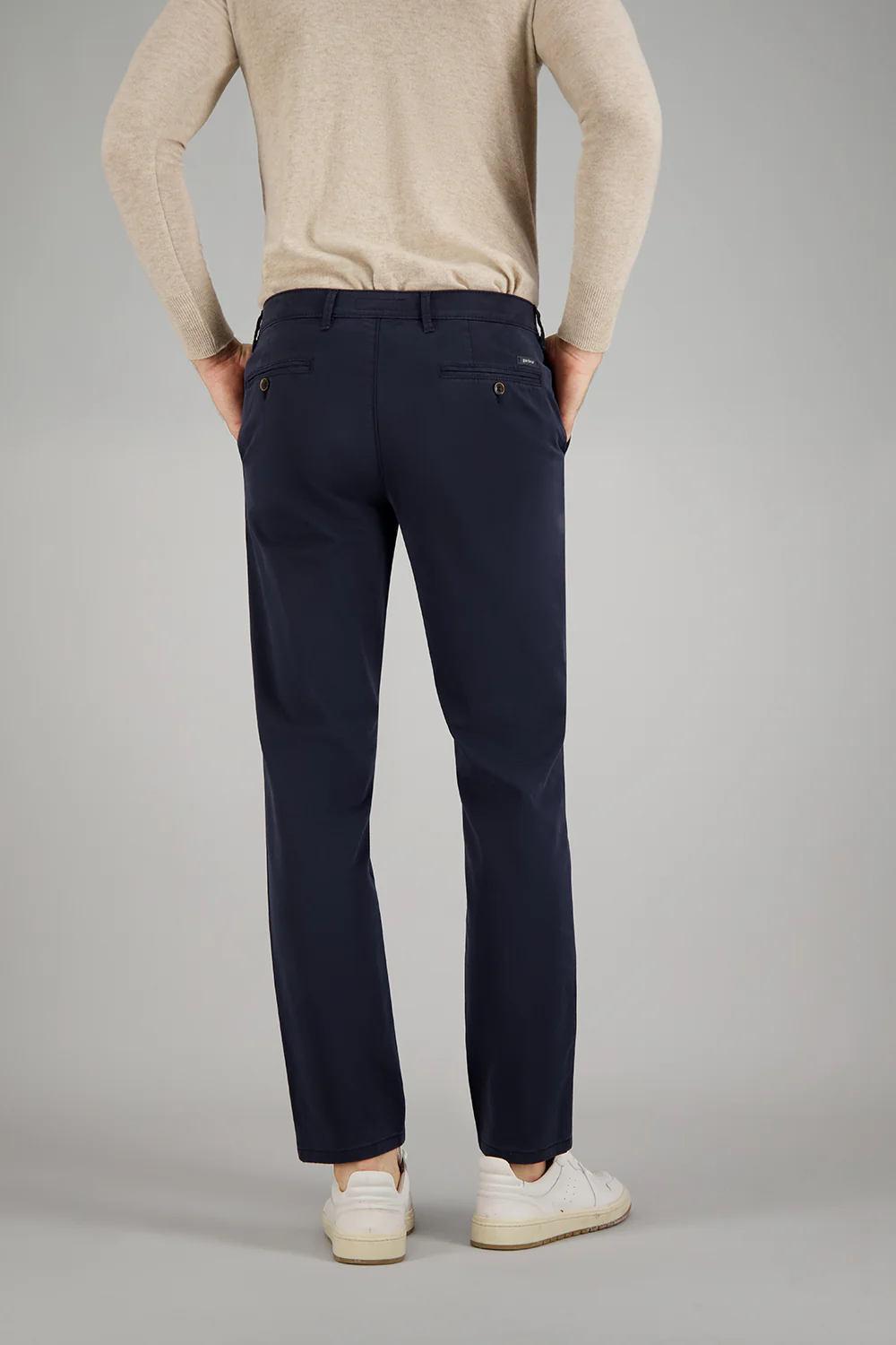 Le chino BENITO de couleur marine allie un style sportif à une élégance sobre. Fabriqué en satin de coton de haute qualité, il convainc par sa coupe moderne, sa liberté de mouvement et sa stabilité dimensionnelle. Parfait pour les looks quotidiens décontractés et élégants. – Modern Fit avec jambe étroite – Taille mi-haute