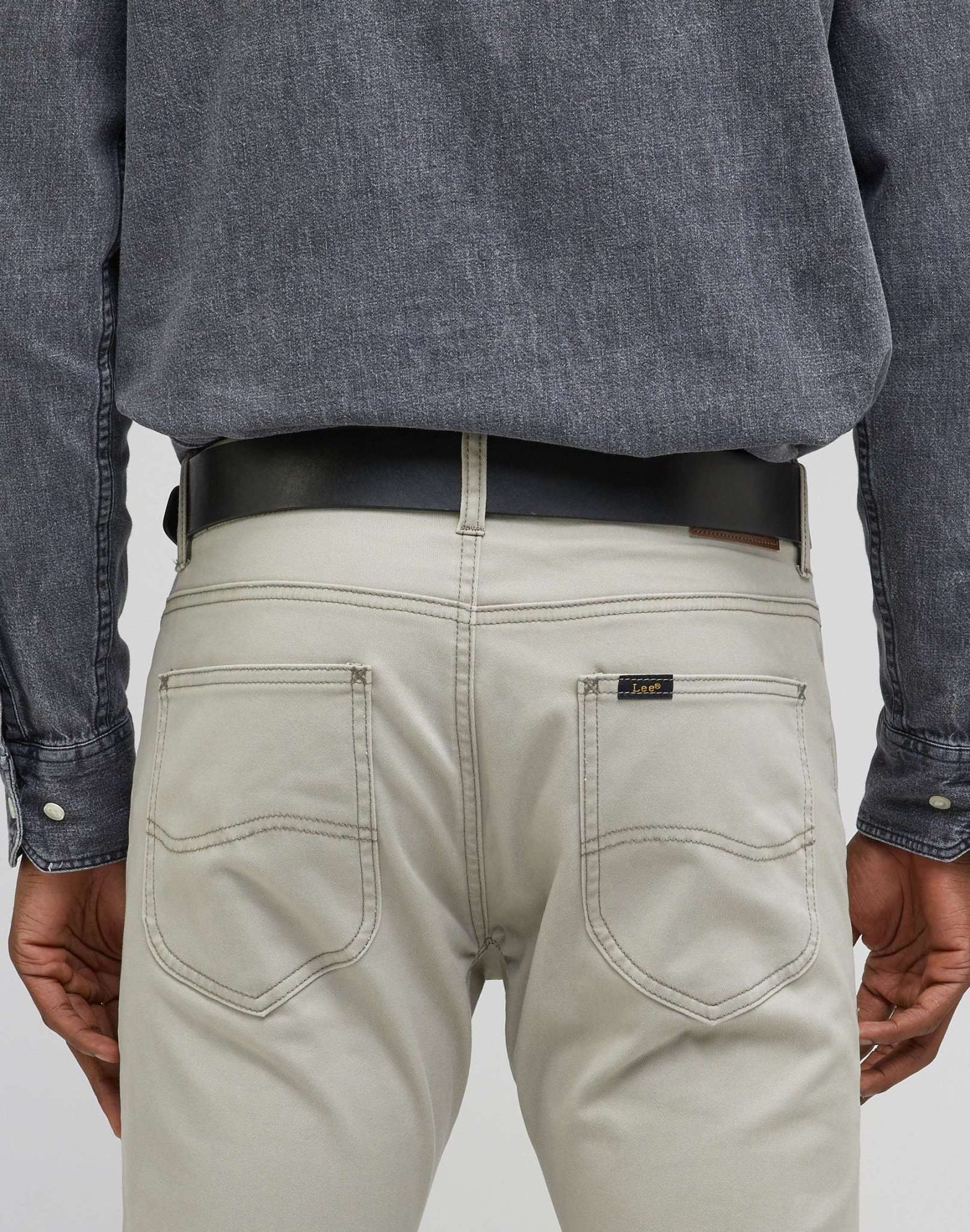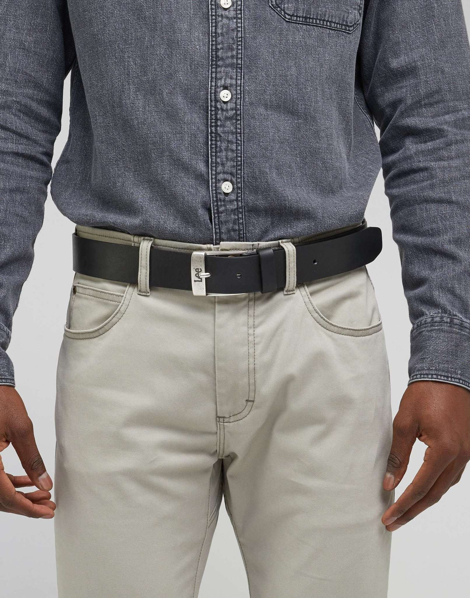 Les détails comprennent le logo Lee qui marque la boucle argentée.