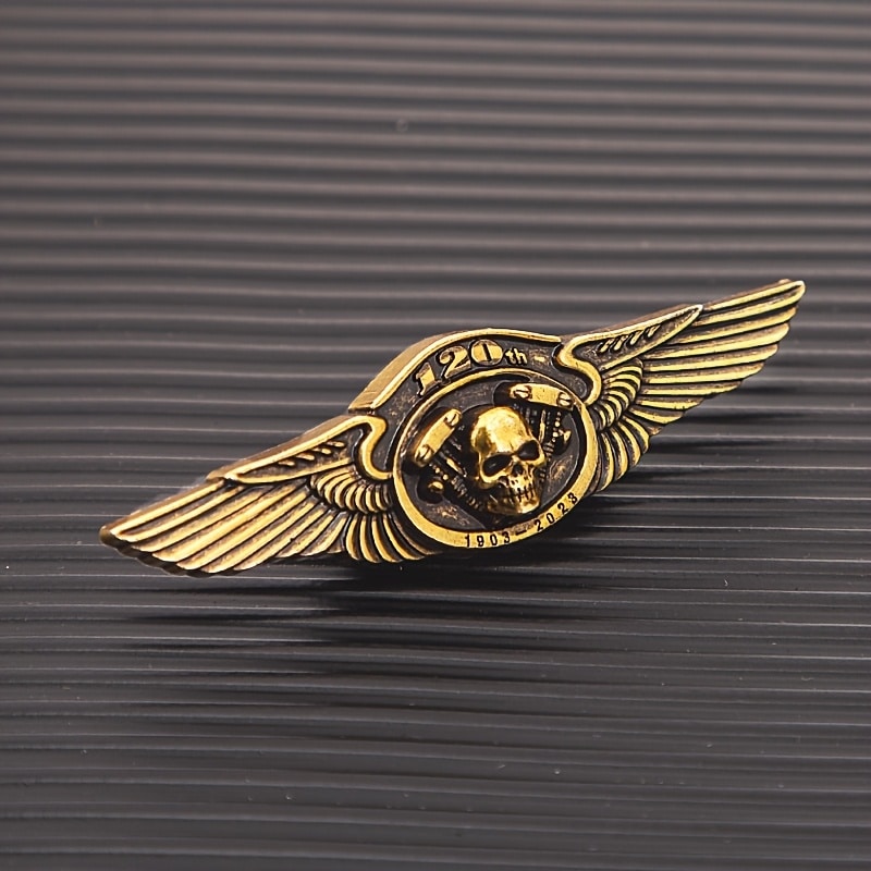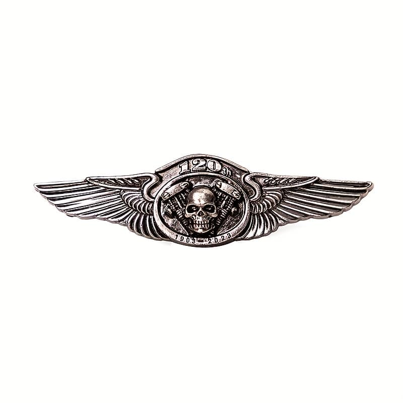 Célébrez l’esprit motard avec cette broche vintage au design audacieux : crâne, ailes déployées et badge « 120th » pour marquer les grands anniversaires moto.