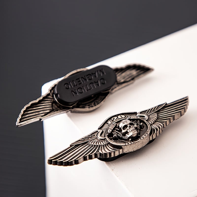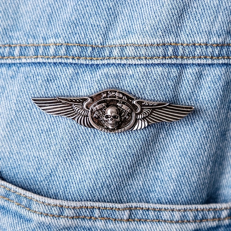 Broche vintage motard avec crâne et ailes. Idéale pour veste, sac ou jean. Accessoire look biker audacieux.