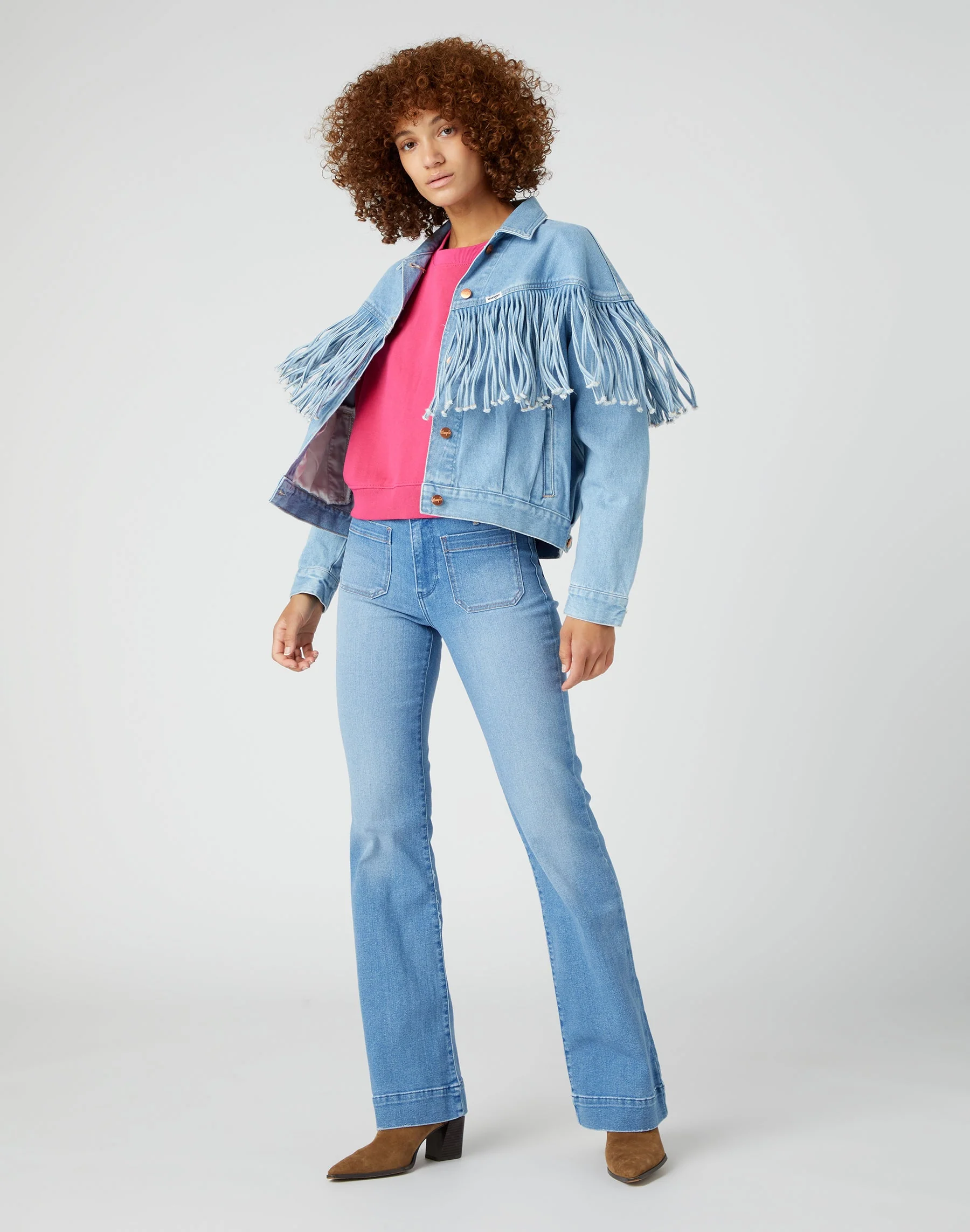 Notre jean flare emblématique est doté d’une taille haute, d’une jambe fine de la hanche au genou, d’une ouverture de jambe évasée classique et d’un écusson aux couleurs de l’arc-en-ciel.