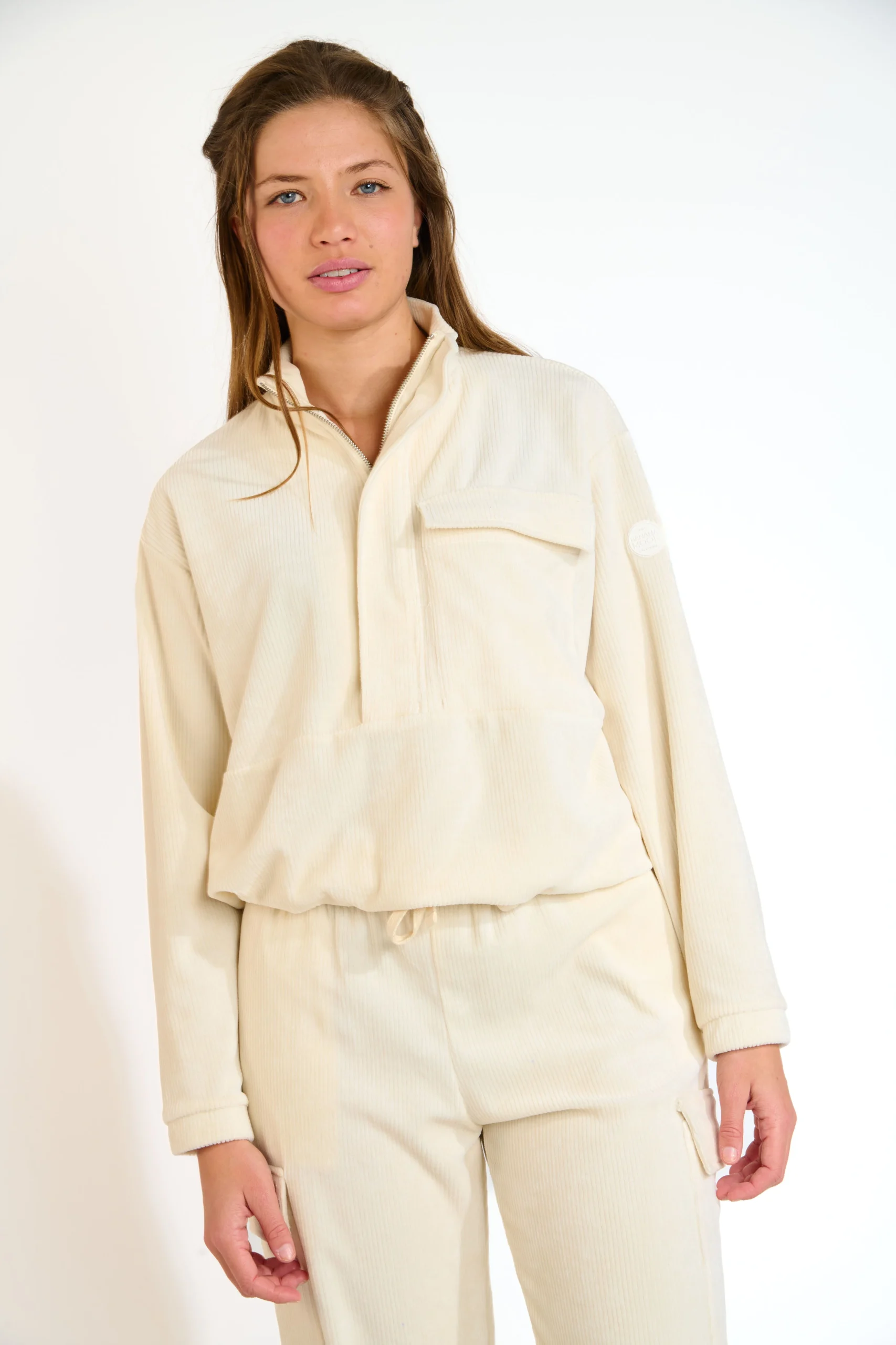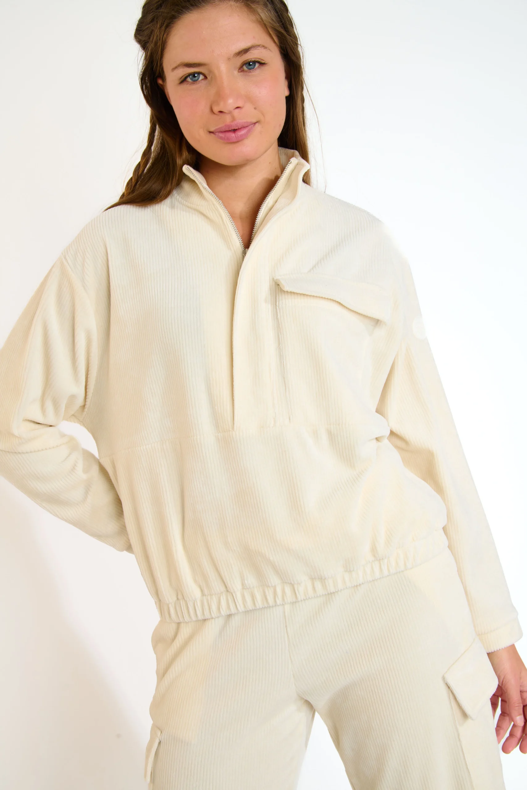 Le demi-zip avec col montant confère au design une note sportive, tandis que la poche poitrine plaquée et le tissu tricoté velouté donnent au look une touche de qualité. La taille élastique à l’ourlet assure un ajustement confortable.