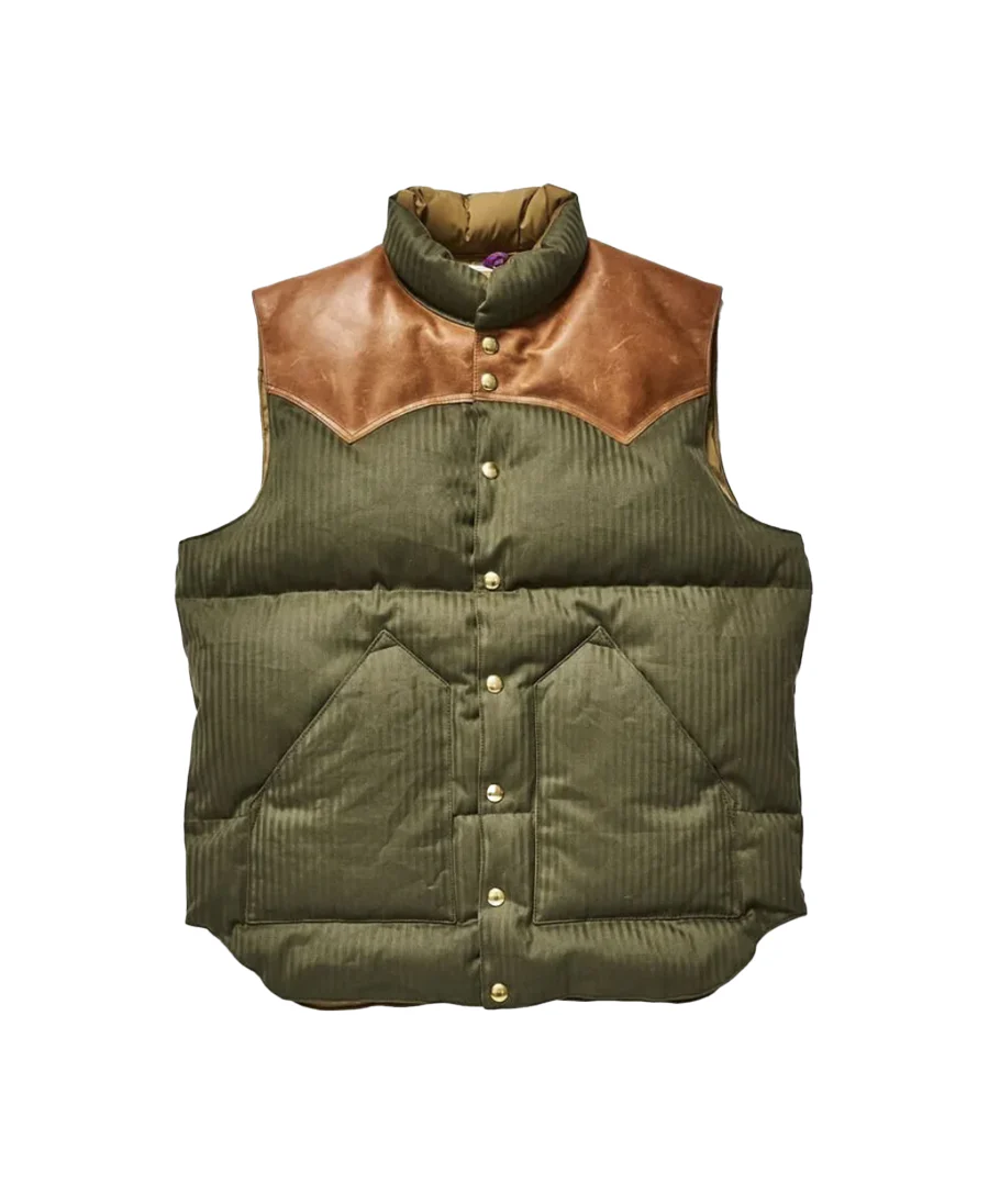 EXCLUSIVITÉ : COLLAB WAREHOUSE X ROCKY MOUTAIN Doudoune sans manches en véritable duvet d’oie d’origine européen, ayant reçu un traitement hydrofuge pour assurer chaleur, isolation et confort. Un must have : idéale sur une veste en jean ou même un blazer à la mi-saison. Couleur : Kaki Made in Japan