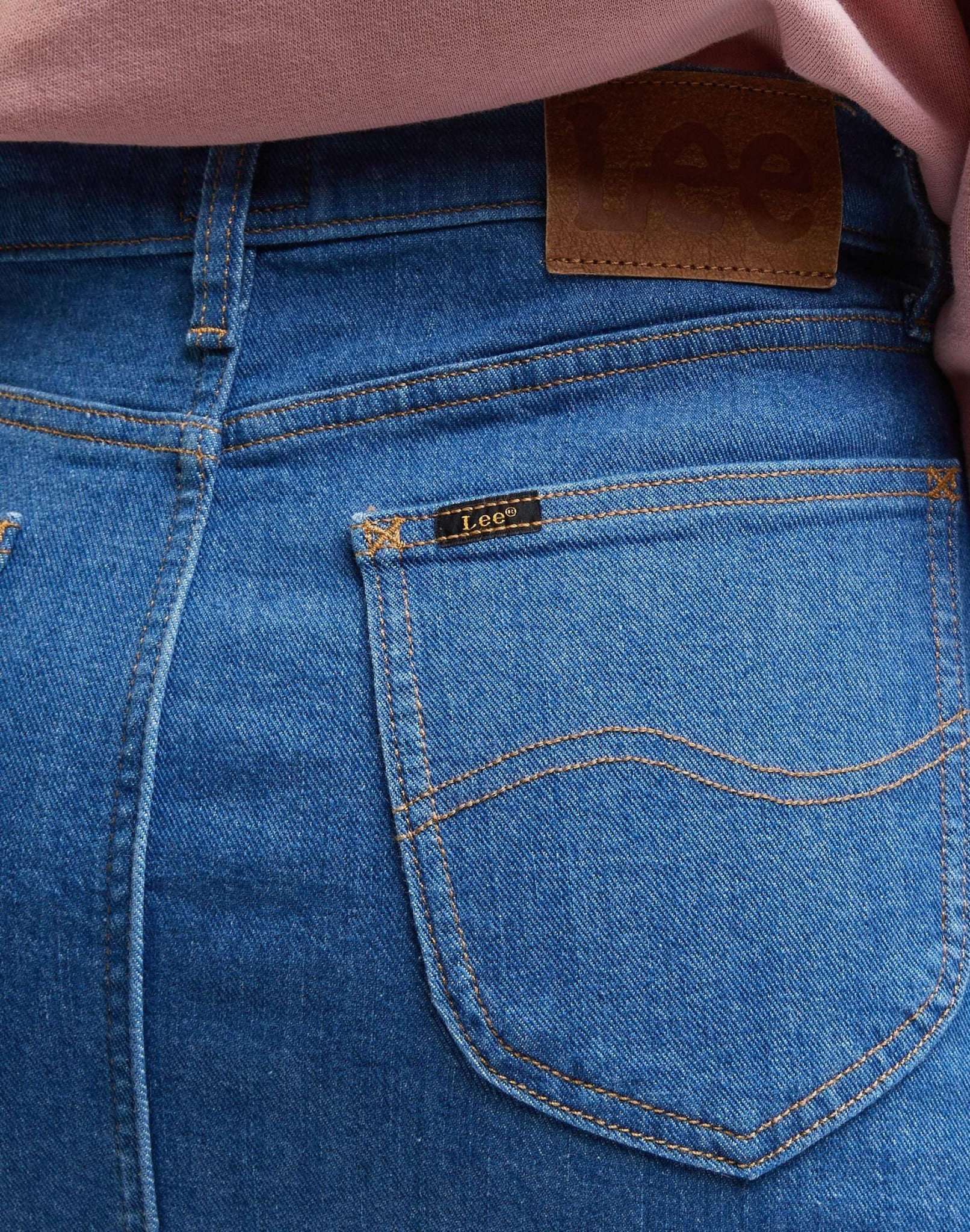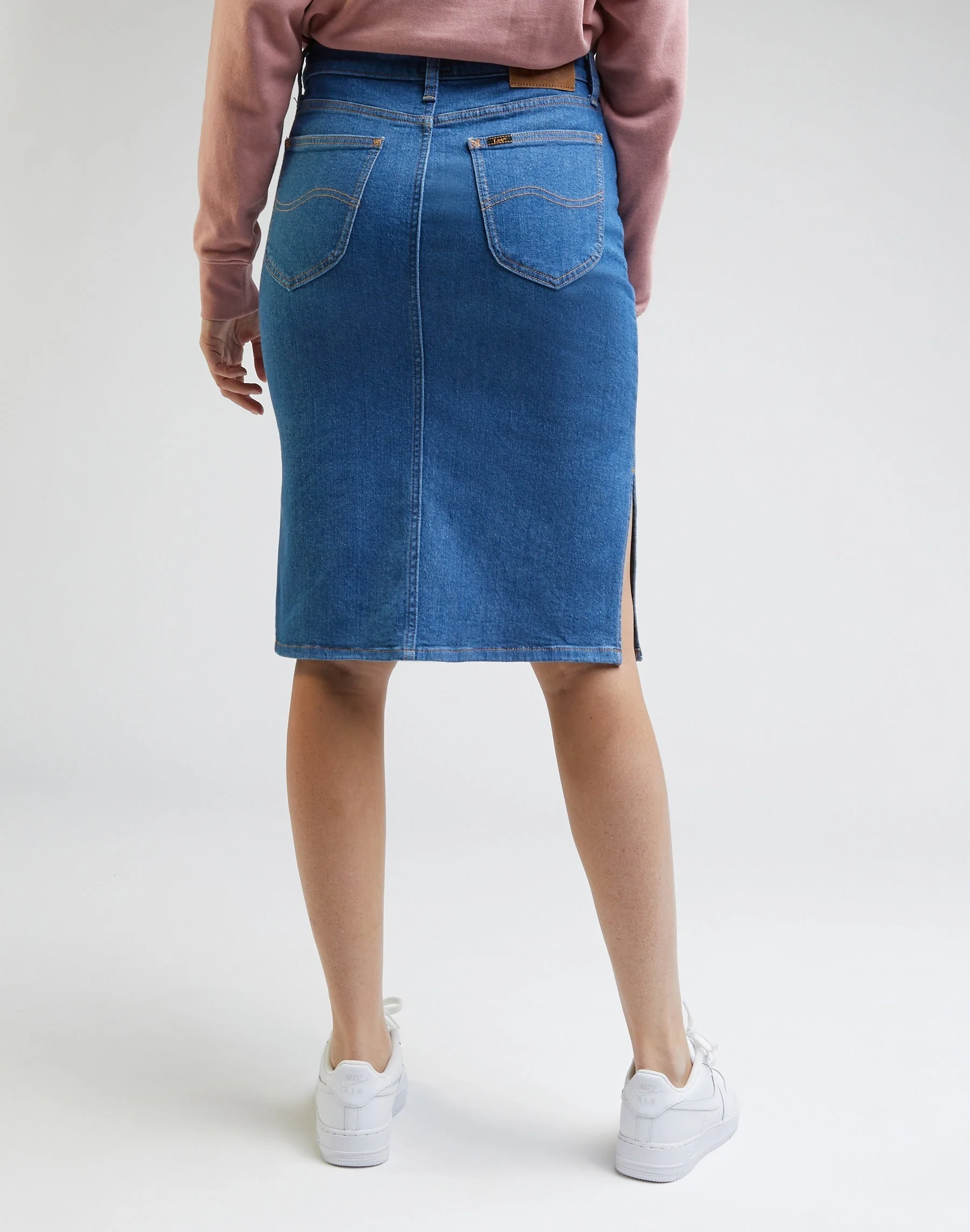 Une jupe en denim svelte et magnifiquement confectionnée. Fabriqué à partir d’un mélange de coton de qualité supérieure et de coton recyclé, ce denim est en matière stretch. Avec un bouton en laiton vieilli et des coutures dorées contrastées, elles offrent un look intemporel. ● Coupe slim