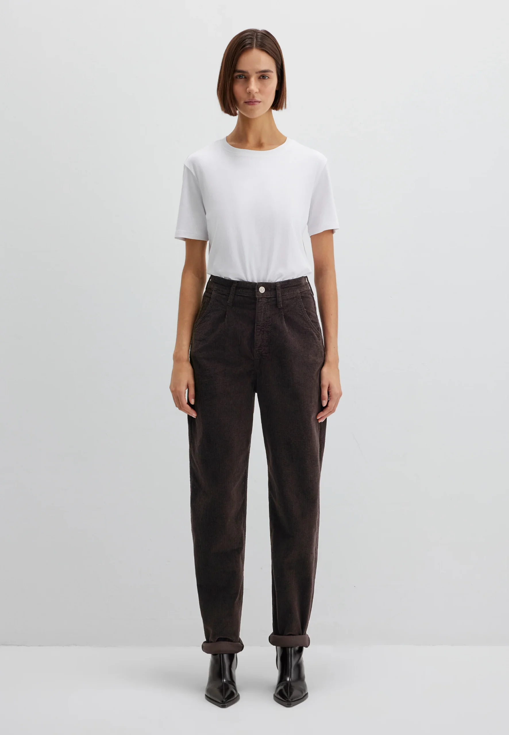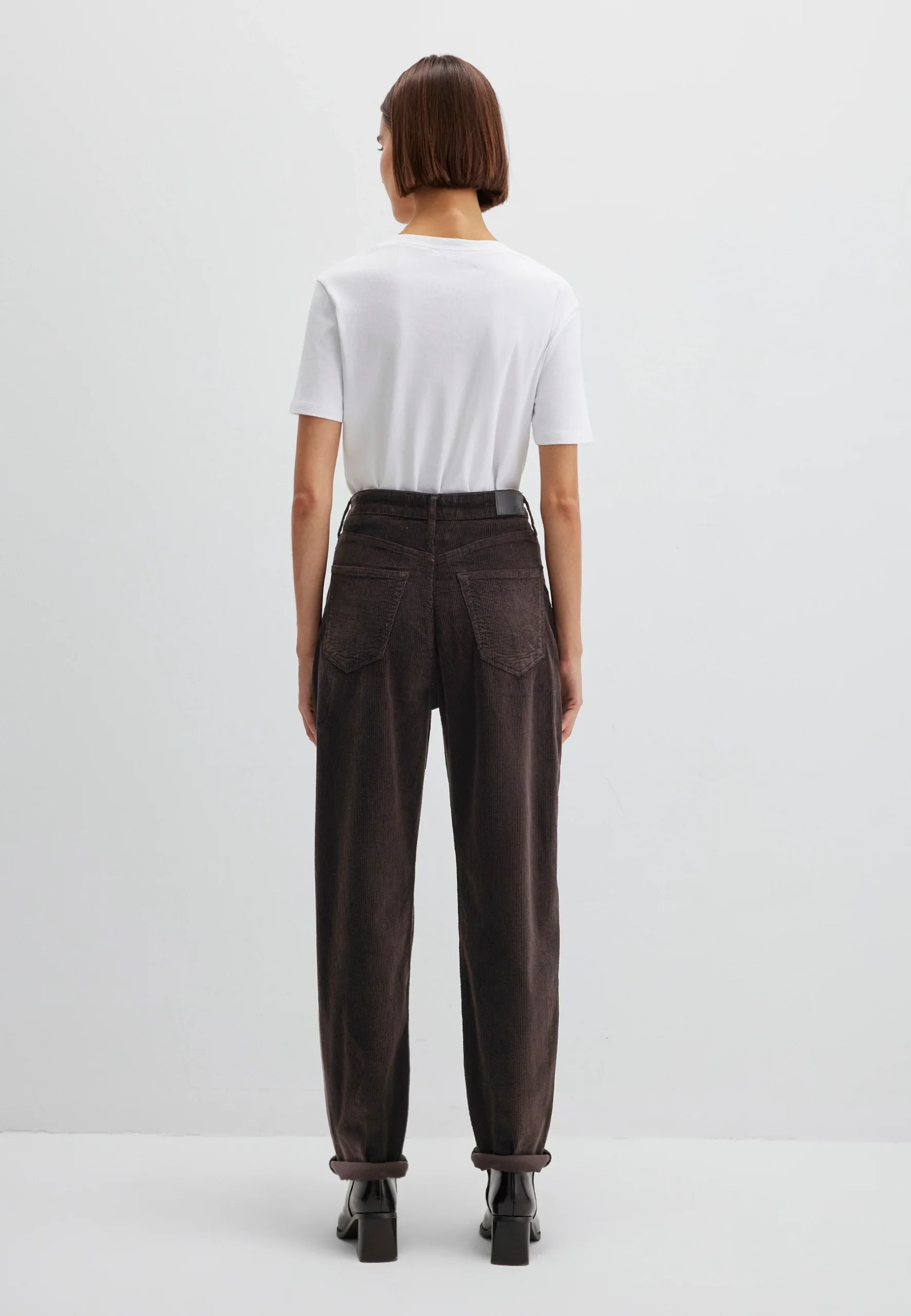 Le modèle Laura en velours côtelé chocolat à taille haute allie confort classique et coupe moderne.