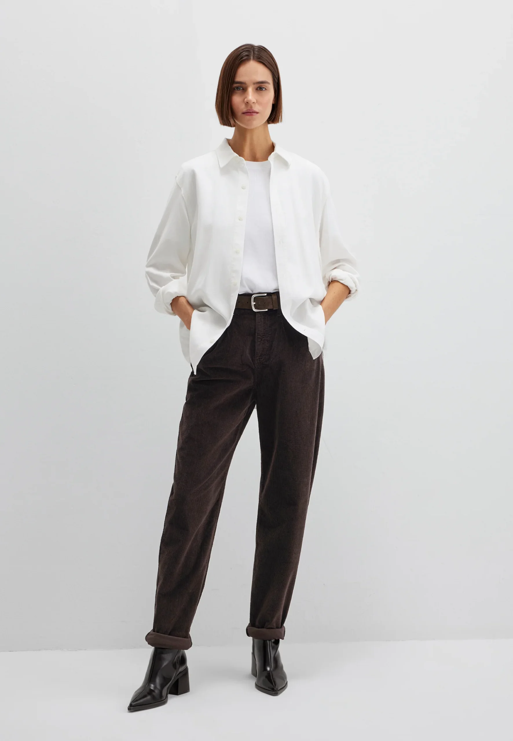 Il présente une coupe droite et ample et est confectionné dans un velours côtelé fin et doux au toucher, avec une structure apparente. Les plis à la taille confèrent à ce pantalon une coupe décontractée, tandis que les poches latérales, les poches arrière et les passants de ceinture constituent des détails pratiques. La fermeture se fait à l’aide d’une fermeture éclair et d’un bouton. Une alternative élégante au jean, polyvalente pour des looks décontractés au quotidien avec un caractère rétro discret.