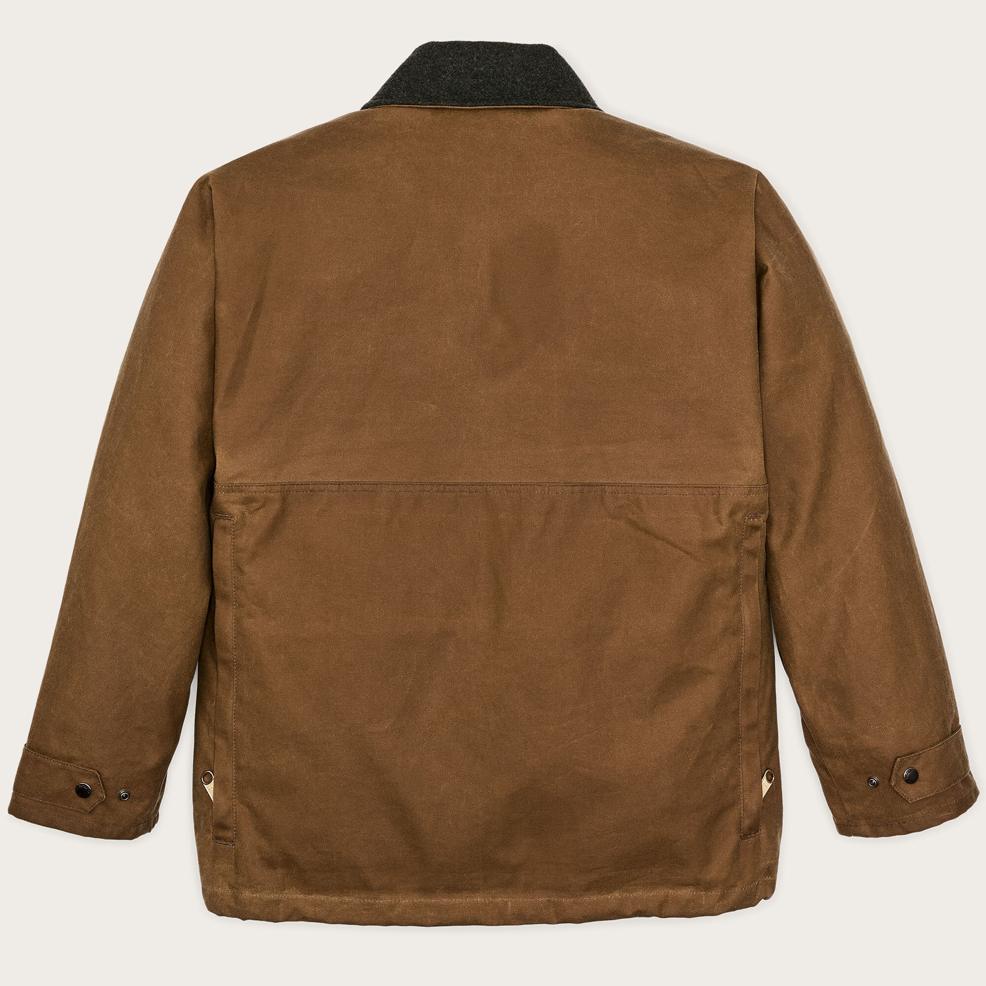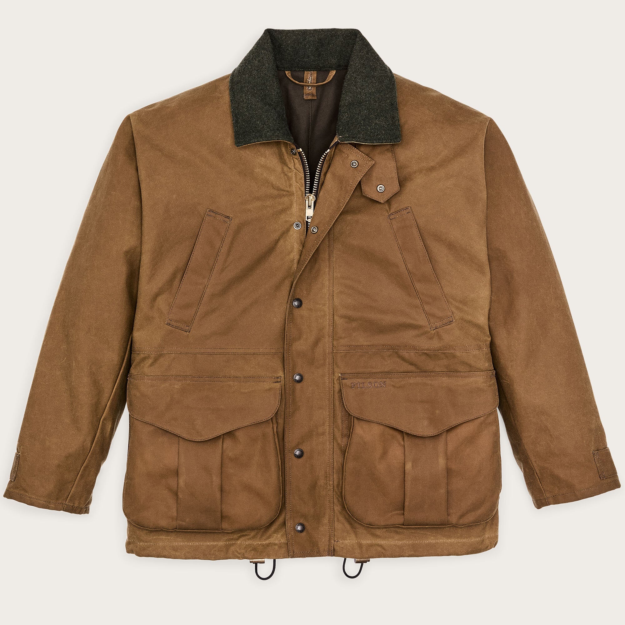 Cette veste en toile cirée résistante à l’eau combine les éléments de conception de nos imperméables éprouvés avec la fonctionnalité sur le terrain de nos vestes de chasse vintage. Elle est fabriquée avec notre emblématique toile cirée Tin Cloth, le tissu iconique qui protège depuis un siècle contre les intempéries des forêts pluvieuses du nord-ouest du Pacifique. La construction de cape sur l’épaule minimise les coutures exposées à la pluie battante. Les séparateurs des poches avant extensibles ont été conçus à l’origine pour séparer les cartouches de fusil de chasse neuves et usagées, et fonctionnent tout aussi bien pour organiser les éléments essentiels. La poche arrière zippée est doublée de nylon pour transporter du gibier ou des objets encombrants. Les poches de main hautes et le col sont doublés de laine Mackinaw chaude. Les doublures Filson sélectionnées peuvent être fermées à l’aide de la fermeture intérieure à glissière. Taille et ourlet réglables par cordon.