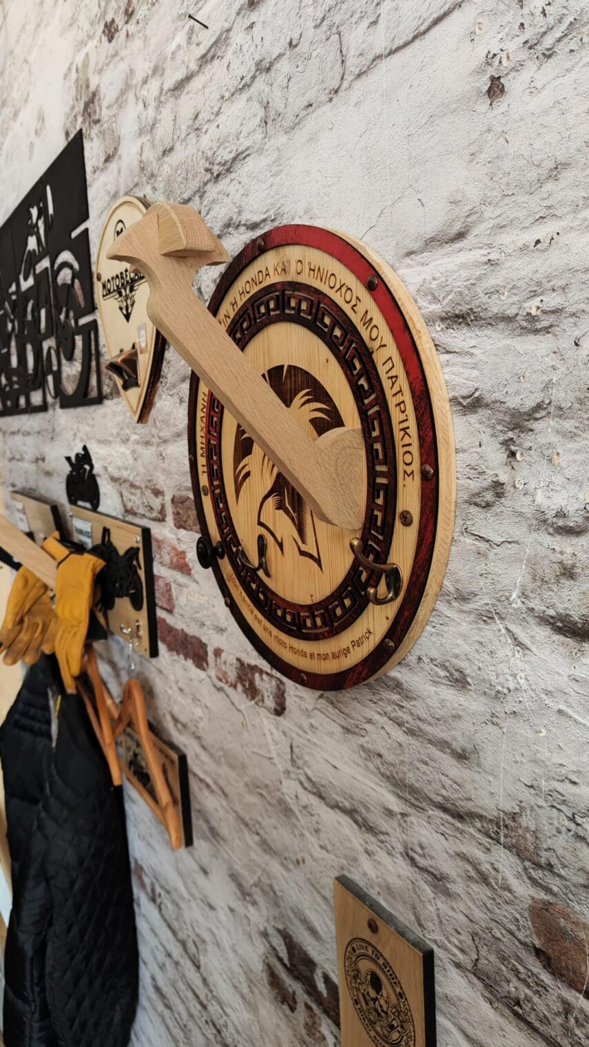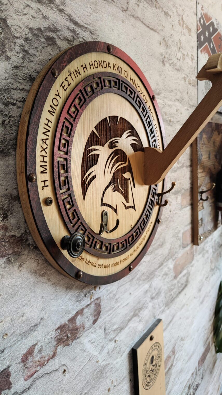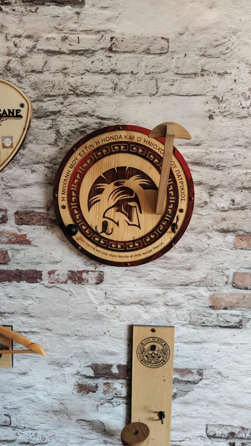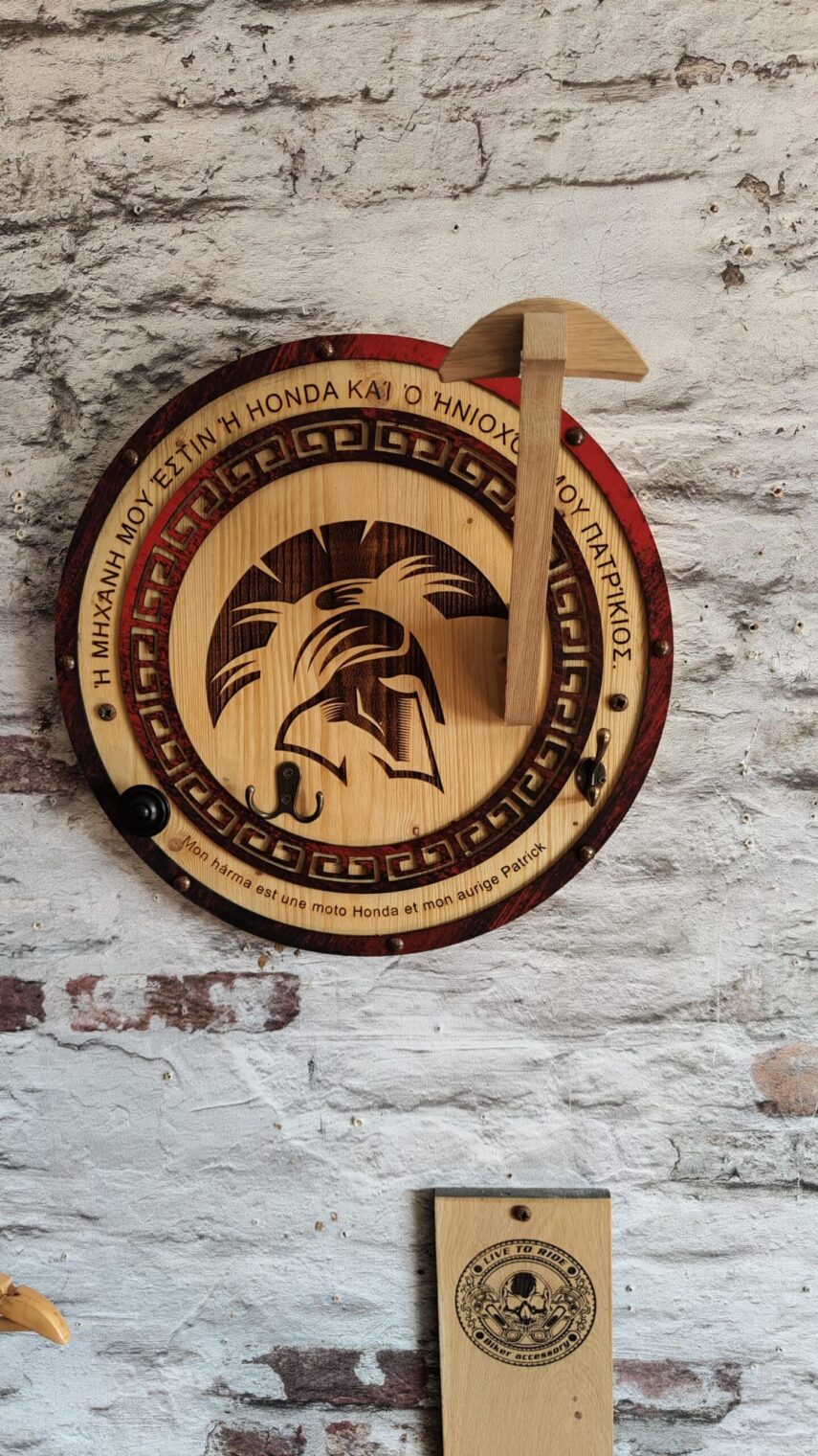 Ce Porte-Casque Style Spartiate est bien plus qu’un simple accessoire pour votre casque de moto. Il représente une fusion artistique de matériaux recyclés et de bois naturel, inspirée par l’histoire antique. Le texte en vieux grec et la possibilité de personnalisation rendent chaque pièce unique, tout en faisant écho à la force et à la noblesse des guerriers spartiates.