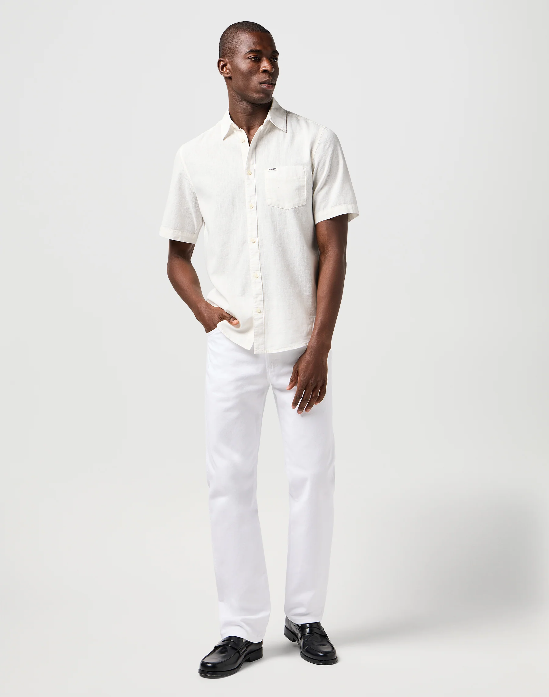 Cette chemise unie offre un confort maximal grâce à sa coupe régulière et à son tissu mélangé coton/lin respirant. Elle possède un ourlet arrondi, une patte de boutonnage et un logo Wrangler tissé qui apporte une touche traditionnelle.