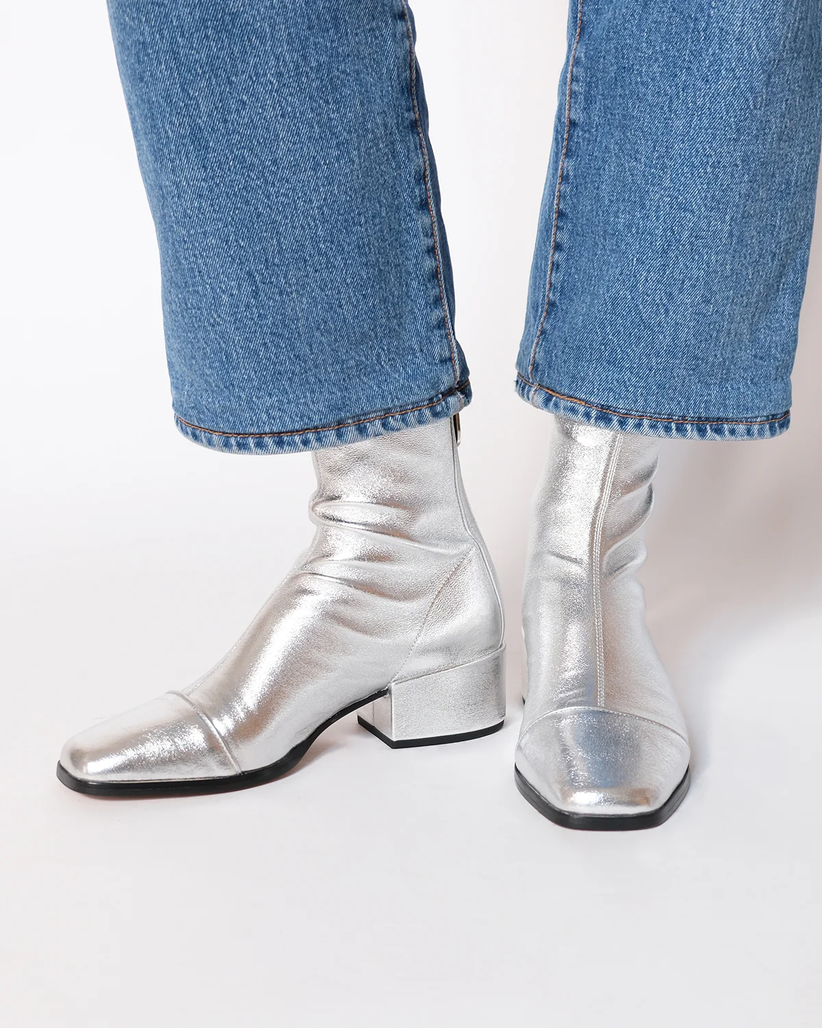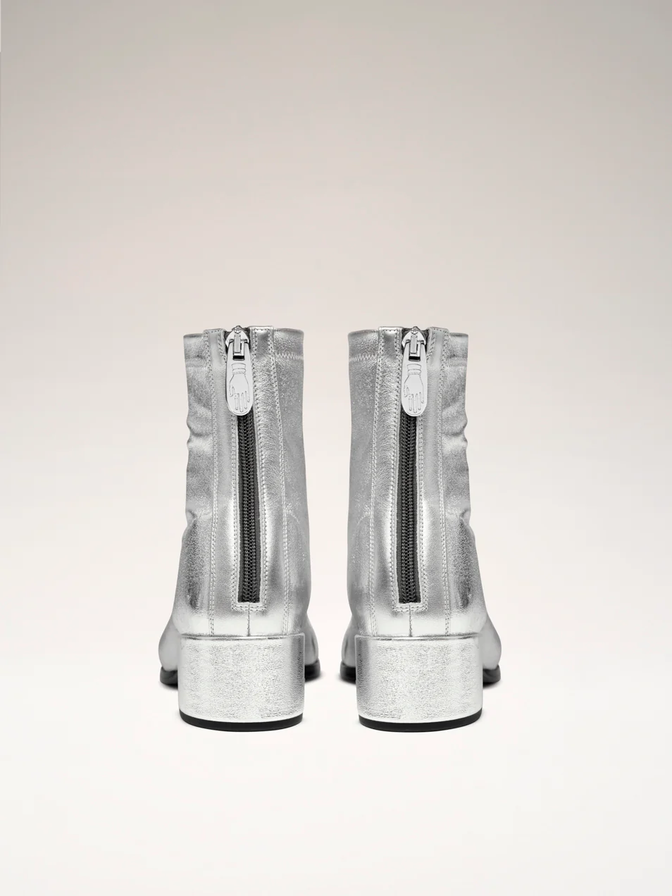La bottine confort et disco ! Hauteur talon : 4cm de confort Extérieur : 100% cuir d’agneau stretch Semelle intérieure et doublure : 100% cuir de chèvre Semelle extérieure : 100% cuir de veau Talons enrobés : 100% cuir d’agneau Bande argent avec zip à l’arrière de la bottine Origine des cuirs : France tannés […]