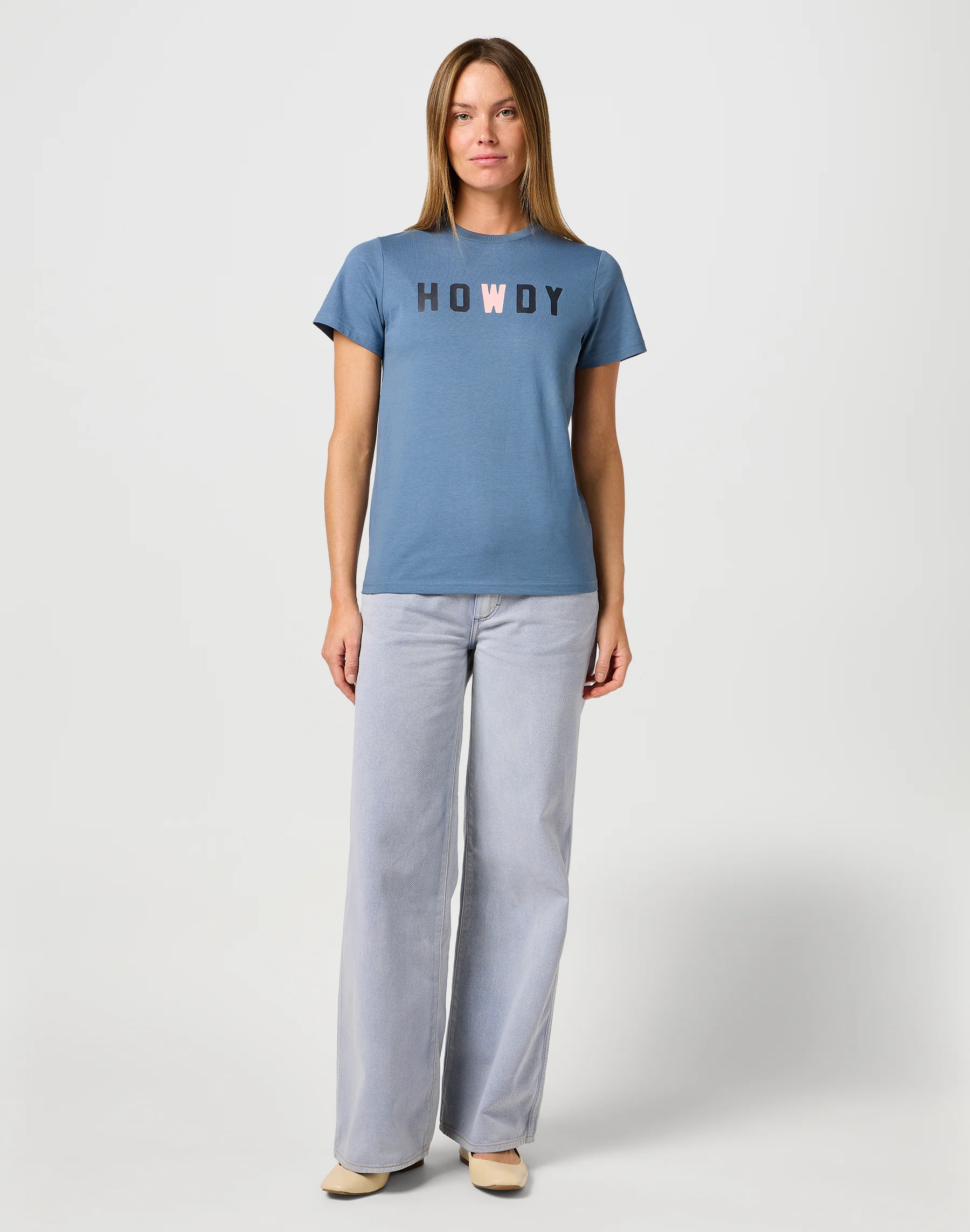 Affiche ton style avec le Tee Graphic en Dusty Blue. Ce t-shirt à manches courtes pour Femme associe un confort décontracté à une impression graphique « Howdy » accrocheuse qui célèbre Western.