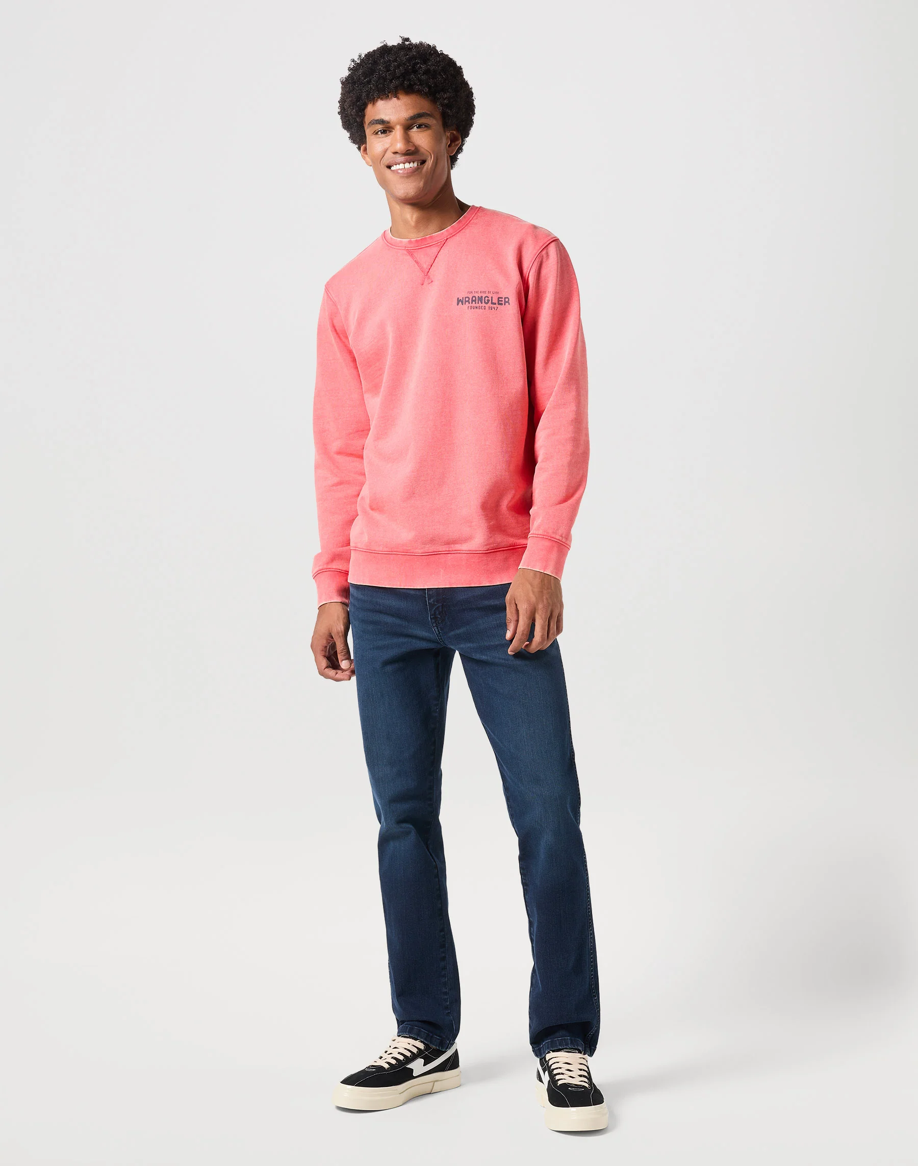 Les détails classiques comprennent une fermeture à glissière avec bouton, le design cinq poches, des poches arrière renforcées et le patch caractéristique en cuir à l’arrière de la ceinture.