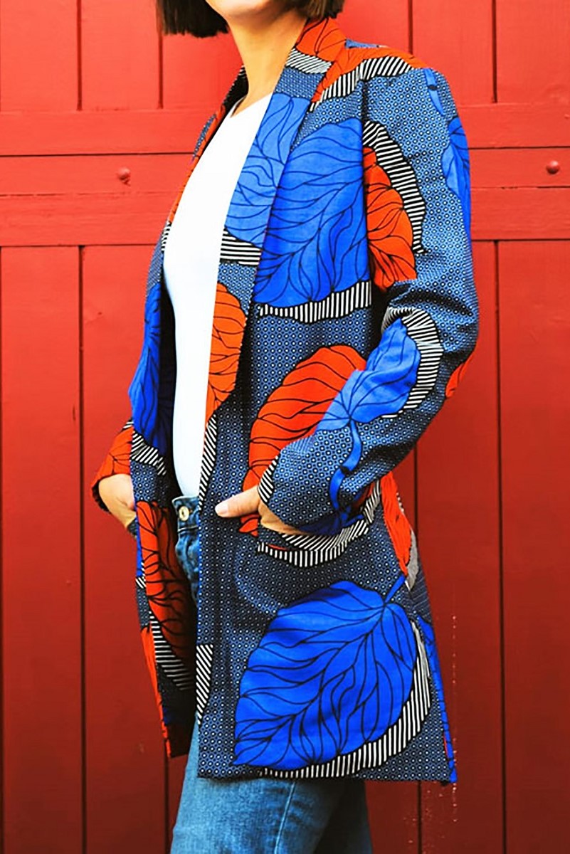 La Veste Blazer Leaf en tissu wax , prénommée ainsi en nommage au motif de cet imprimé. Ce modèle associe l’incontournable veste blazer au tissu africain 100% coton.