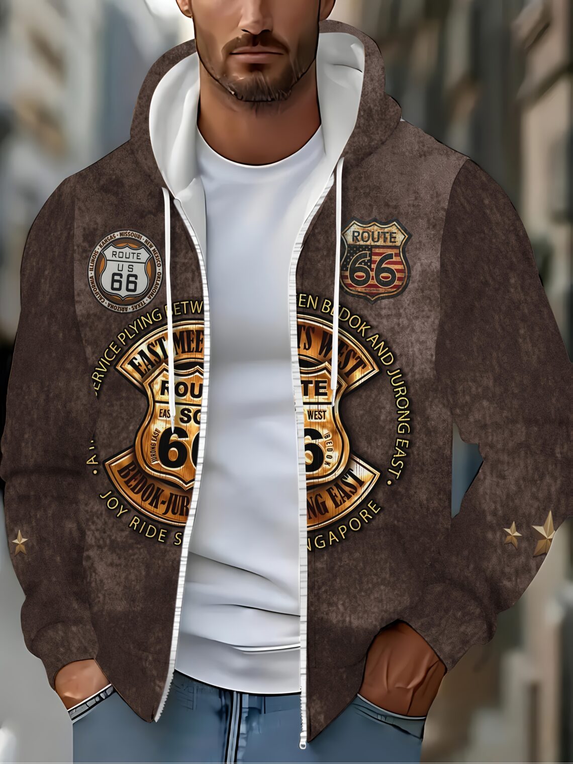 Veste à capuche vintage Route 66 pour homme, chaude et confortable avec imprimé rétro. Parfaite pour l’automne et l’hiver. Style motard affirmé.